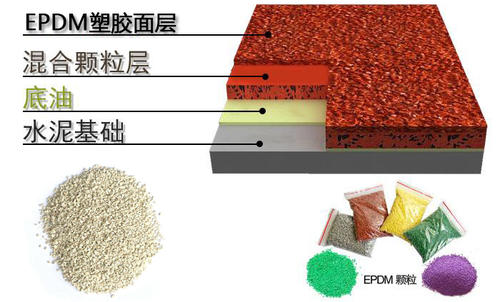 EPDM产品是针对需求高安全性地面的用户。 EPDM颗粒由合成橡胶制成,可以生产多种颜色,且以其优异的性能可抵抗紫外线照射和耐一般化学反应。特别是在有图案的施工时,更能显现EPDM彩色颗粒的优越性。